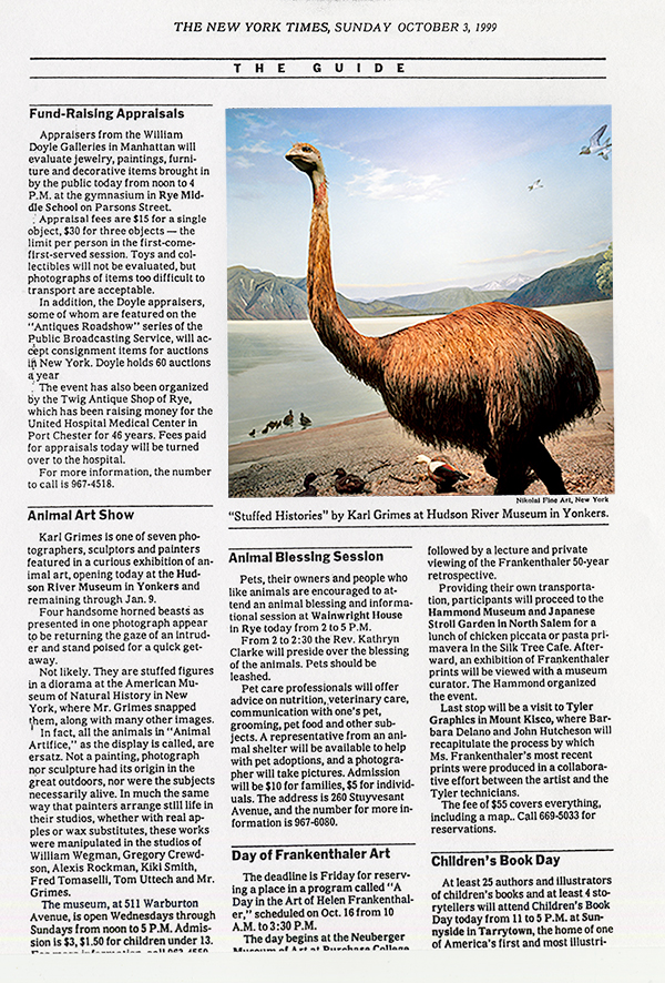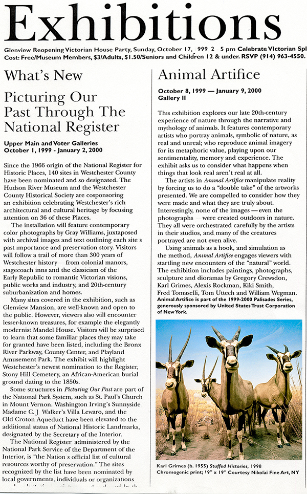 The New York Times, October 3, December 5, 1999. Dominick Lombardi review of the exhibition 'Animal Artifice' at the Hudson River Museum, NY.